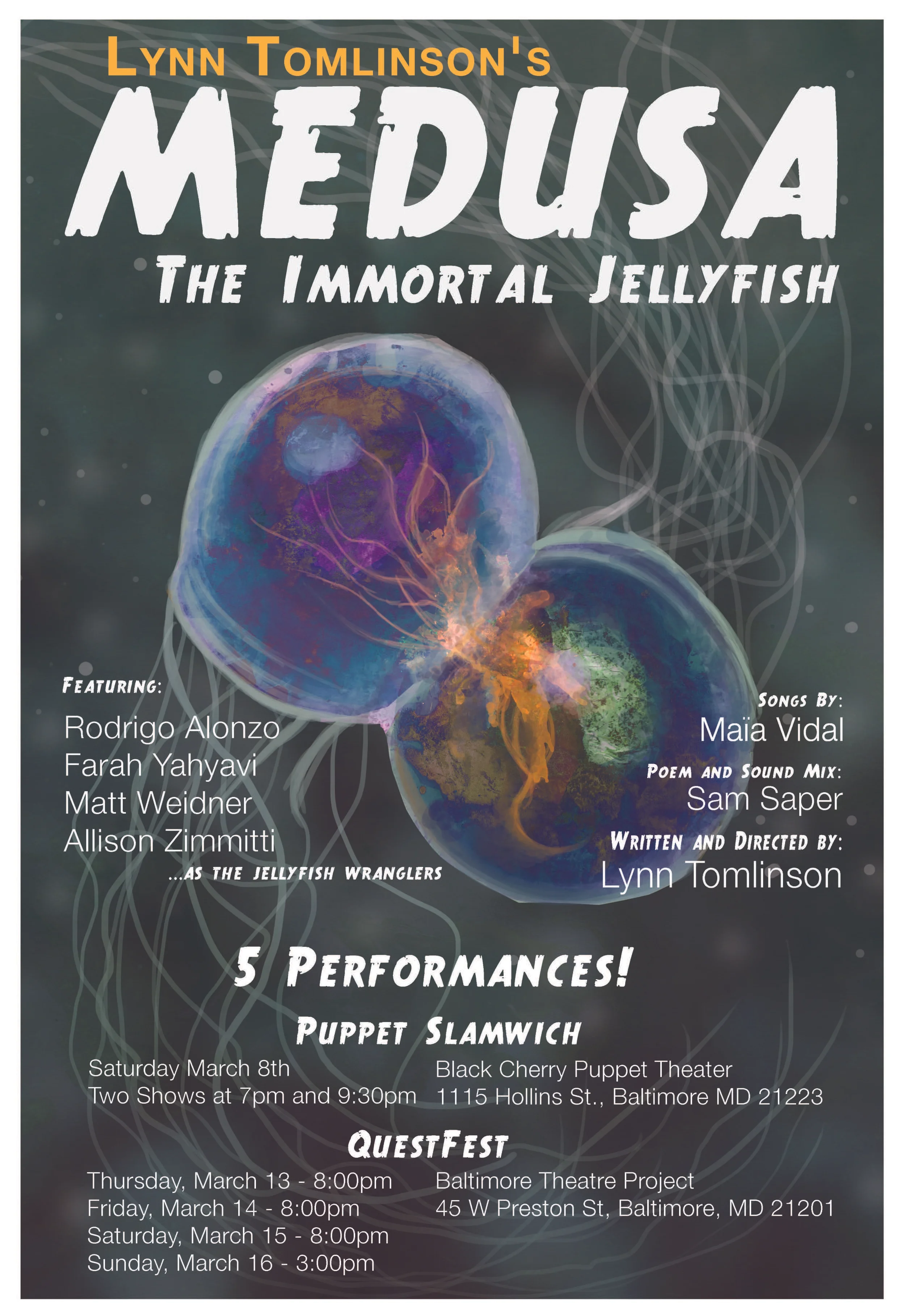 And then we showed four times for QuestFest Visual Theatre Fest at the Theatre Project in Baltimore, in a performance along with Los Angeles-based animator/performer Miwa Matreyek. We were able to try out some new things in front of these audiences (including a pink swim cap!) and these tweaks helped our piece get stronger each time. We included the text of the poem by Sam Saper in the program, so people could read it as they waited for the show to start, and that set the stage very well. We got some great feedback, and the Jellyfish Wranglers and I had a great time.